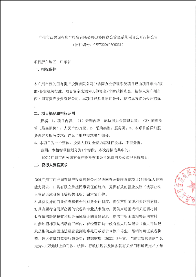 广州市西关国有资产投资有限公司OA协同办公管理系统项目公开招标公告【项目编号:GZHY22QY02C0231】