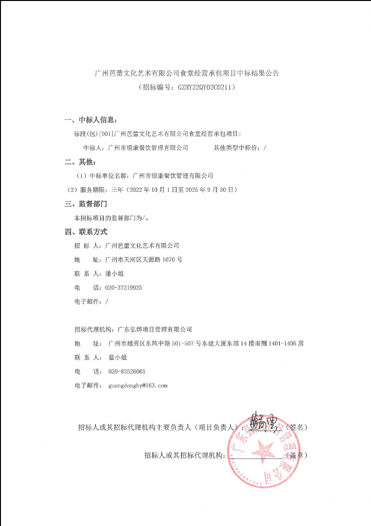 广州芭蕾文化艺术有限公司食堂经营承包项目中标结果公告【项目编号:GZHY22QY02C0211】