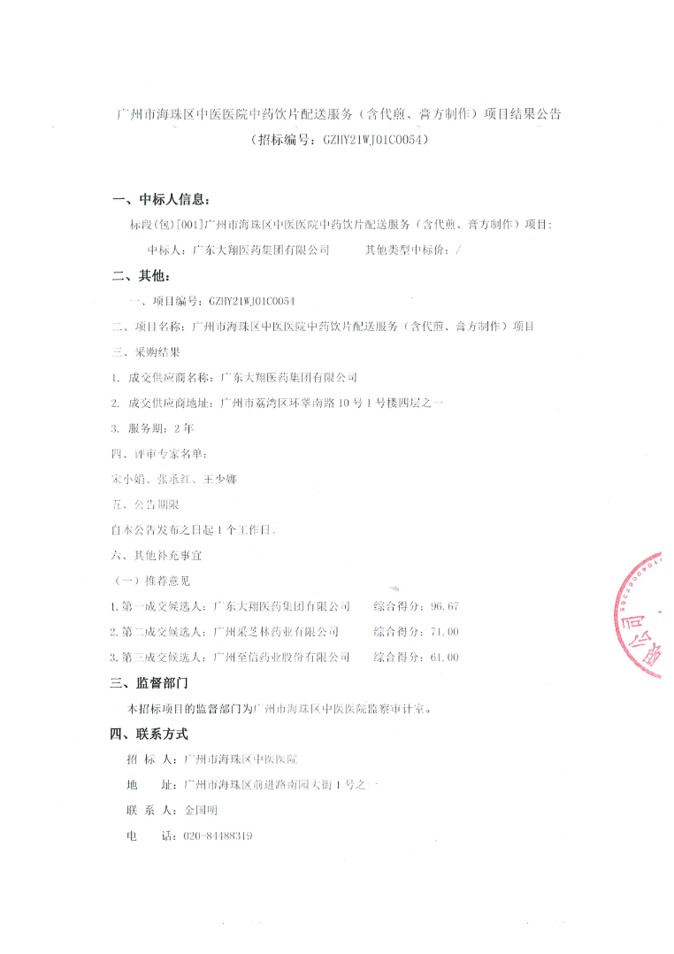 广州市海珠区中医医院中药饮片配送服务(含代煎、膏方制作)项目成交公告[项目编号:GZHY21WJ01C0054]